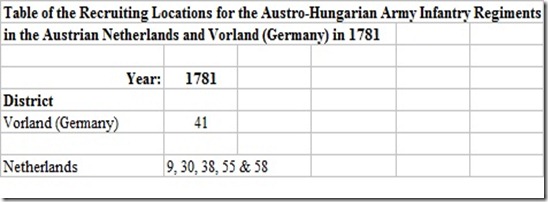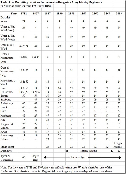 In Alphons Wrede’s book: Geschichte der k. und k. Wehrmacht[viii] (History of the Austro-Hungarian Armed Forces) volume 1, there are charts for each region of the Empire called the Uebersicht der Werb- (Ergänzungs-)Bezirks-Eintheilung von 1781 bis 1889. These charts show in which counties each infantry regiment recruited during any period of time.